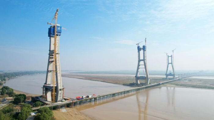10月25日,蘭封高速項目東壩頭黃河大橋最后一座主塔——90號墩主塔順利封頂。至此,項目的控制性工程黃河大橋三座主塔提前兩個月全部封頂,標志著蘭封高速項目建設取得了重要的階段性成果,大橋建設全面進入鋼梁架設和斜拉索安裝階段。