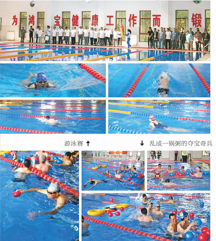 熱身賽后,全體人員集合后,列隊行進到比賽場地桂苑泳館,準備進行下午的比賽。下午的比賽項目為300米個人游泳、4X60米游泳接力賽及水上趣味賽奪寶奇兵。參賽運動員換上比賽泳裝后各就各位,隨著哨聲想起,比賽正式開始。無論是個人比賽還是團體比賽,各參賽隊員懷著“會當擊水三千里”的豪情,各個精神飽滿,奮力拼搏,只見大家你追我趕,互不相讓,自由泳劈波斬浪,蛙泳優(yōu)美矯健,泳池里浪花翻騰、人影起伏,引來現(xiàn)場喝彩聲一片,氣氛相當活躍。各團隊選手團結協(xié)作,互相配合,拉拉隊員們加油鼓勁助威聲給選手們增添了動力與激情,游泳館內(nèi)頓時熱鬧非凡,激烈的比賽真正體現(xiàn)了力量與速度的比拼,幾輪比賽下來,團隊的比分逐漸拉開。