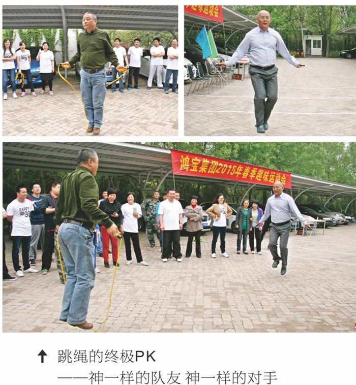 當天的比賽項目為個人跳繩、集體跳大繩、拔河比賽,各隊隊長帶領團隊投入了比拼。跳繩是充滿活力的運動,在精力充沛的鴻寶人的熱情參與下,顯得更加活蹦亂跳、生機勃勃、斗志昂揚。“一、二、三……”為了集體的榮譽,齊心協(xié)力,運動員們使出渾身解數(shù),跳繩被甩得飛快,不時被跳繩絆住,但立即又調(diào)整……個人跳繩后,集體跳大繩比賽開賽啦!跳大繩最考驗的是團隊的配合,任何一個隊員的失誤都會影響整個團隊。只見大繩有節(jié)奏、有韻律地凌空搖著,參賽隊員們協(xié)調(diào)一致、輕盈地跳進跳出,圓滿地完成了各隊的任務。