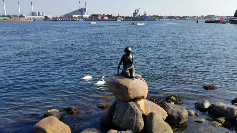 坐落在海峽礁石上的美人魚,嫻然自在的美麗天鵝,交相輝映