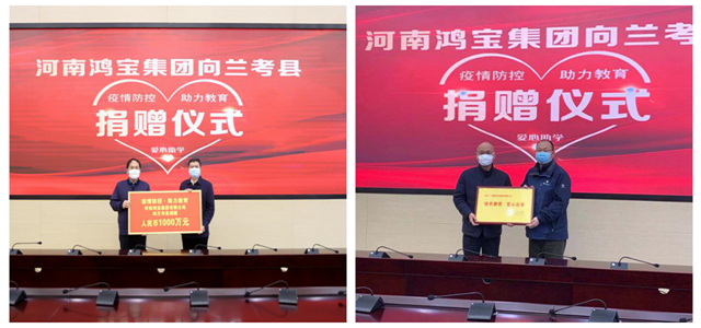 2020年2月12日,在新冠肺炎疫情防控的關(guān)鍵時(shí)期,河南鴻寶集團(tuán)有限公司黨委書記鄧和平、副總裁劉英、總會(huì)計(jì)師劉秋花和總裁辦公室同志前往蘭考縣,舉行“疫情防控·助力教育”愛心捐贈(zèng)活動(dòng),向蘭考縣捐贈(zèng)人民幣1000萬元,用于支持當(dāng)?shù)氐慕逃畔⒒ㄔO(shè),以減輕疫情對(duì)農(nóng)村孩子受教育的影響。