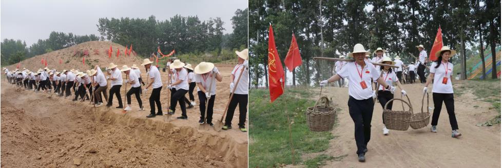 在基地入口處,四個(gè)大隊(duì)齊聲誦讀了習(xí)近平總書記緬懷焦裕祿同志時(shí)創(chuàng)作的詩詞《念奴嬌·追思焦裕祿》,隨后依次簡要學(xué)習(xí)了“四面紅旗”村莊自力更生的典型事跡,并來到張莊沙丘遺址進(jìn)行勞動(dòng)競賽,挖泥、推車、種樹,勞作體驗(yàn)用“翻淤壓沙”和“貼膏藥扎針”等科學(xué)方法治理災(zāi)害的過程。