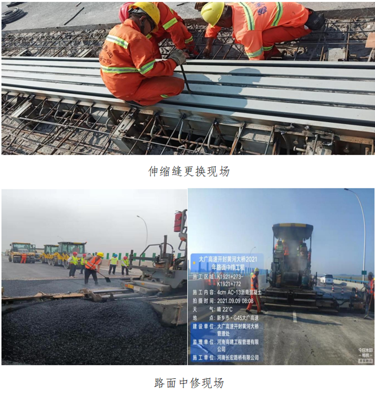 2021年,根據《河南省高速公路養護管理提升三年行動方案》的要求,大橋公司科學決策,決定開展伸縮縫更換、路面中修等多項專項施工,雖然受極端天氣及疫情的影響,工期短、任務重,但是大橋公司前期充分準備,施工中各環節銜接有序,對施工進度、工程質量、安全管理方面嚴格把控,仍然按時保質完成了各項專項施工任務。