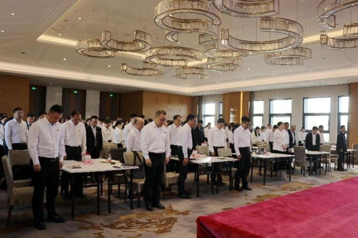 上午8:00,伴隨著東方紅的鐘聲,在袁桂寶董事長的倡議下,與會人員懷著沉痛的心情聆聽了黨和國家的卓越領導人、國務院原總理李克強同志的訃告全文,并全體起立默哀,表示深切哀悼。