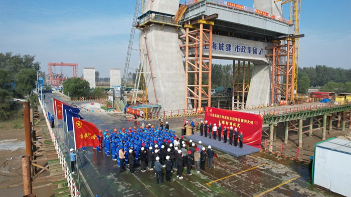 上午10點18分,東壩頭黃河大橋主塔封頂儀式在黃河大橋90號墩舉行,現場彩旗飄揚,禮炮齊鳴,隧道股份上海城建副總裁胡軍,河南鴻寶集團副總裁、項目公司總經理劉英,上海城建市政集團黨委副書記、總經理劉喜東等參加儀式。